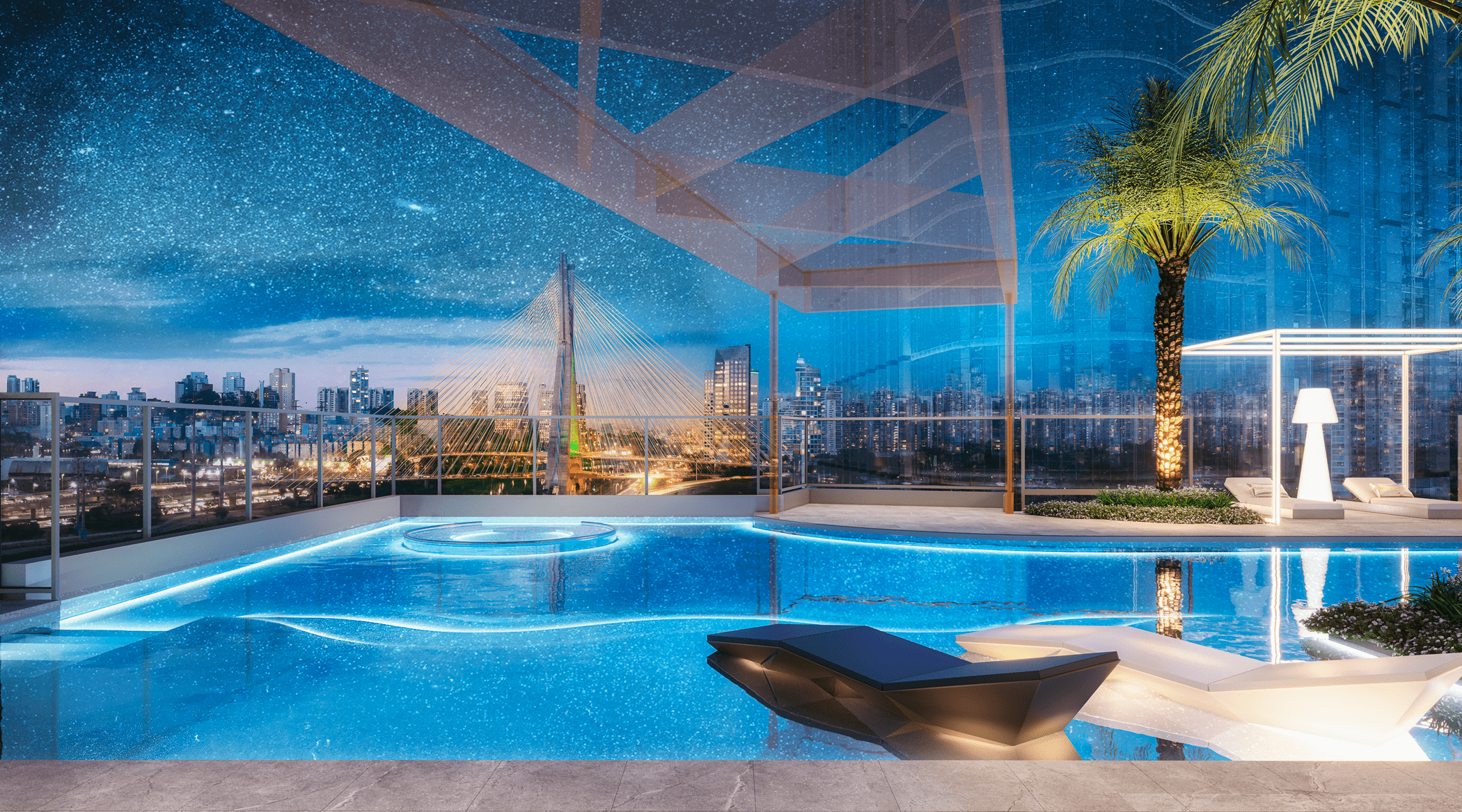Le Mandarim The Legend est un projet emblématique de design futuriste dans le quartier de Brooklin. Situé au bord du Rio Pinheiros et offrant une vue imprenable sur le Pont Estaiada, cet emplacement sera le nouvel épicentre du luxe et des loisirs à São Paulo, alliant parfaitement vie urbaine et nature.