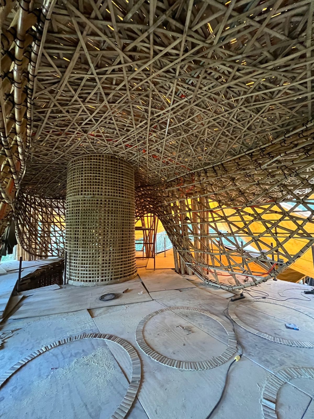 Nos constructions sont constituées de structures en bambou tressé, équarries et fixées à partir de la base, ce qui pose le grand défi architectural de la création d’un treillis en bambou.